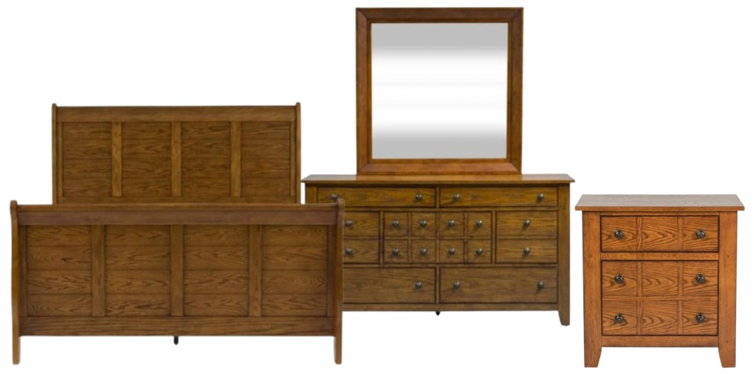 Complete your rustic American look with the Grandpa’s Cabin queen sleigh bed, dresser, mirror, and nightstand. Crafted of rubberwood solids and oak veneers, this kit features complete case dust proofing to protect your contents, French and English dovetail drawer construction, full extension and fully stained interior drawers.Read More