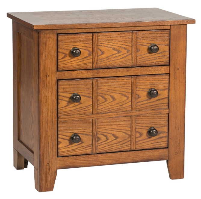 Staple any room with this rustic American style night stand. Constructed with select hardwoods and ash and oak veneers, this piece features an aged oak finish, complete dust proofing and antique brass knob hardware. With wood and peg accents, this night stand is sure to bring uniqueness and functionality to any room.Read More
