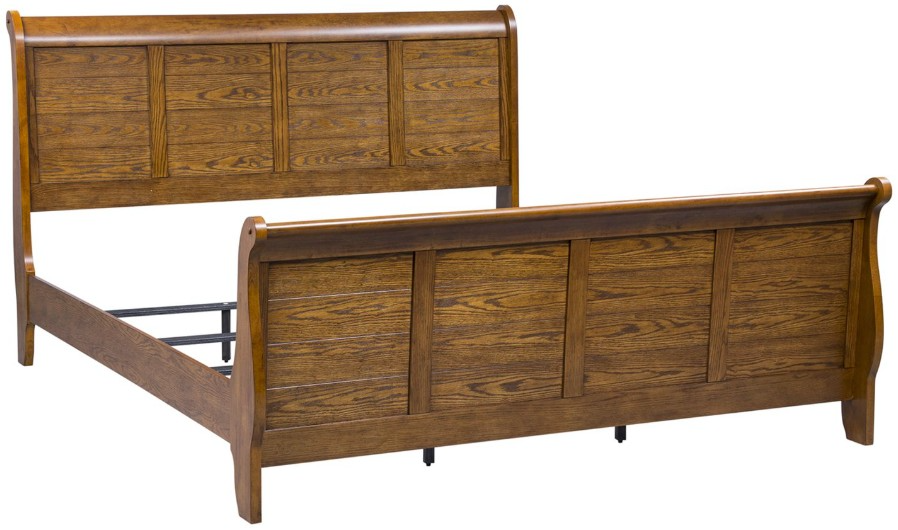 Staple any room with this rustic American style king California sleigh bed. This piece features an aged oak finish, center slat supports, and a bolt on rail system. With wood and peg accents, this bed is sure to bring uniqueness and functionality to any room, allowing for a craftsman feel.Read More