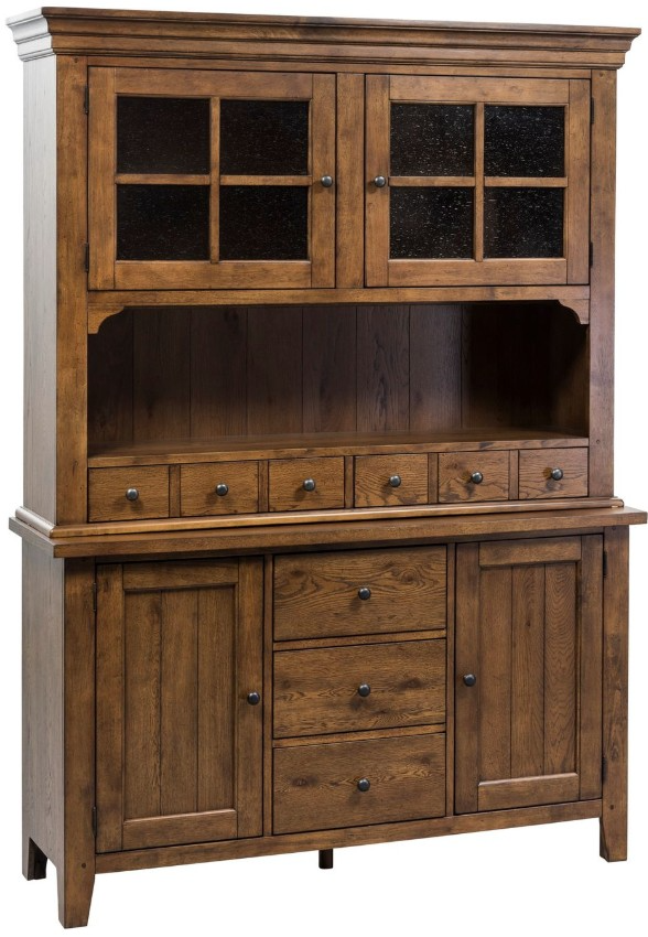 Accent your space with the Hearthstone Ridge hutch and buffet. Crafted of rubberwood solids and oak veneers, this piece features a rustic oak finish, full extension drawers, and antique brass knob hardware. With vintage appeal, hearthstone is a casual, rustic style that never goes out of fashion.Read More