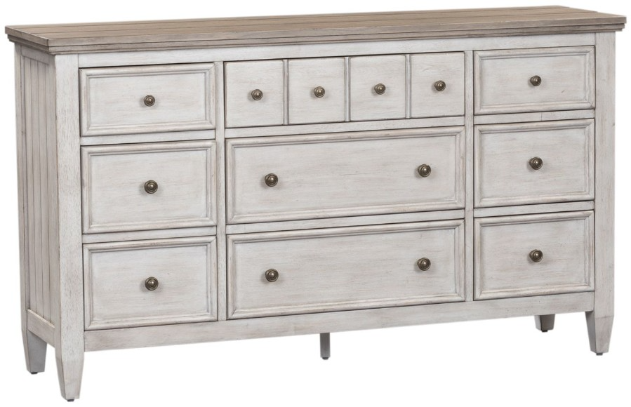 The Heartland 9-drawer dresser is sure to make a statement in any home, as its heavily distressed finish is adaptable to any space. The antique white finish and tobacco tops are accented by raised panels and antique brass hardware. Many drawer sizes allow you maximize storage.Read More