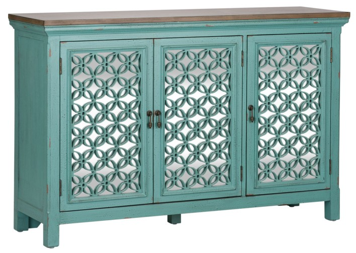Transform your home with the Kensington 56" accent cabinet. Crafted of Eucalyptus solids and Ash veneers in a wire brushed Turquoise finish and Spice wood tone top. Features three mirrored doors with decorative floral pattern overlays, block feet and one concealed fixed shelf behind doors.Read More