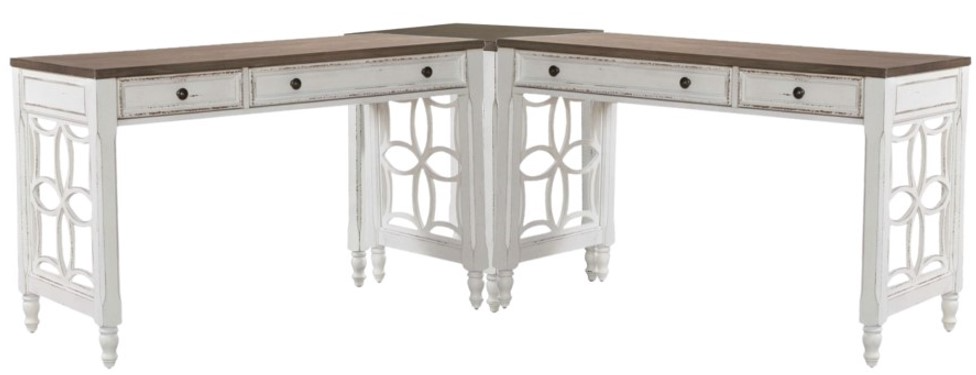 Indulge in the perfect blend of European design with the Magnolia Manor L shaped desk. Crafted of poplar solids with white oak and birch veneers finished in a warm distressed antique white and whitewashed brown top.Read More