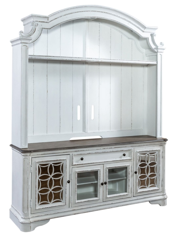 This European traditional styled entertainment center is sure to be the focal point of any living room. The 74" console features two wood framed glass doors flanked by antique mirror doors, with a decorative grid panel.Read More