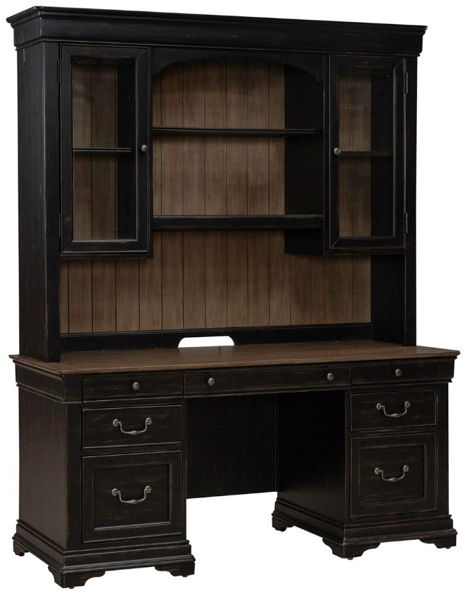 The jr. executive desk and credenza each have 7 drawers with wood-framed fronts. Each drawer is designed to provide ample storage space while exuding timeless charm. Among these, two locking file storage drawers offer added security and organization for your important documents. Also included is a flip down keyboard drawer offering a seamless solution for your typing needs while ensuring efficient wire management. Illuminate your work area with ease, thanks to the touch LED and task lighting integrated into the hutch. Whether you're burning the midnight oil or tackling deadlines during the day, this lighting solution ensures optimal visibility for enhanced productivity. Adorned with two wood-framed glass doors, accented with Antique Pewter knob hardware, this credenza hutch exudes timeless elegance. Behind each door, discover a wealth of storage options with one adjustable wood-framed glass shelf, allowing you to showcase your prized possessions or keep essential items within easy reach. In the center, against a striking planked back panel in the Carmel finish, rests an open adjustable wood-framed glass shelf. This contrasting feature not only adds visual interest but also provides additional storage space for your convenience. With wire management provisions discreetly integrated into the design, you can bid farewell to cluttered cables and tangled wires, keeping your workspace neat and always organized.