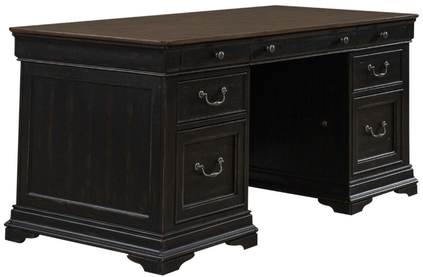 Among these, two locking file storage drawers offer added security and organization for your important documents. Also included is a flip down keyboard drawer offering a seamless solution for your typing needs while ensuring efficient wire management. The desk is further distinguished by its heavy base molding, which not only adds structural integrity but also lends a refined finish to the piece. Completing the look are the Antique Pewter bail pull and knob hardware, providing a tasteful contrast and enhancing the overall traditional-inspired allure of the desk. Make an impressive statement with the Meritage jr. executive desk.