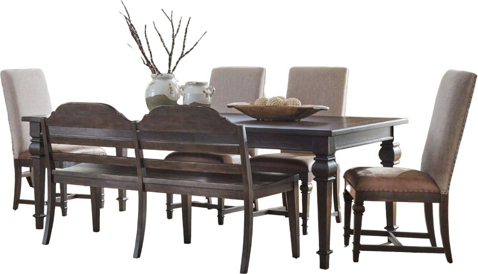 Includes the rectangular leg table, four upholstered side chairs, and the ladder back bench