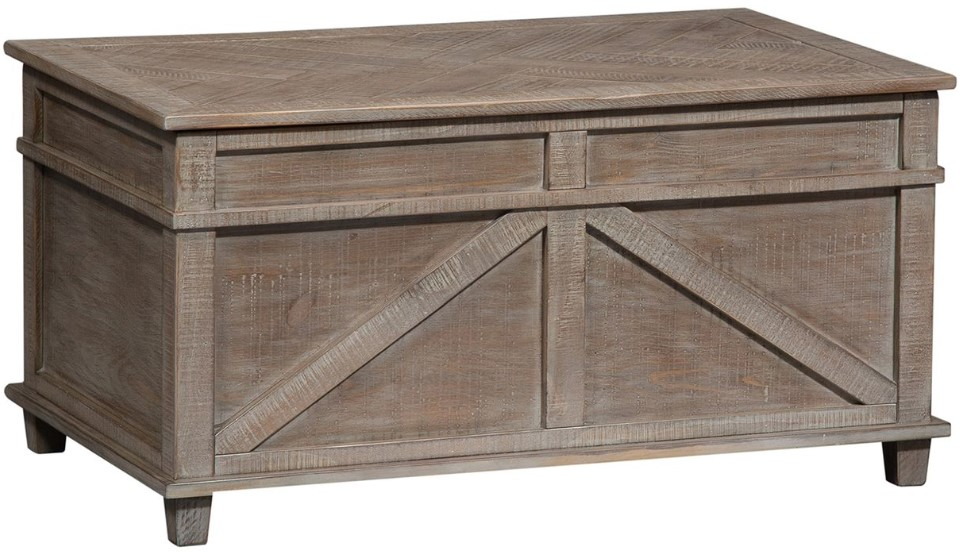 Accent your space with the contemporary Parkland Falls storage trunk. Crafted of pine solids and knotty pine veneers, this piece features a weathered taupe finish with saw mark distressing, an appealing planked top, casters for easy moveability, a felt lined removeable jewelry tray, and a cedar lined interior with abundance of storage space.Read More
