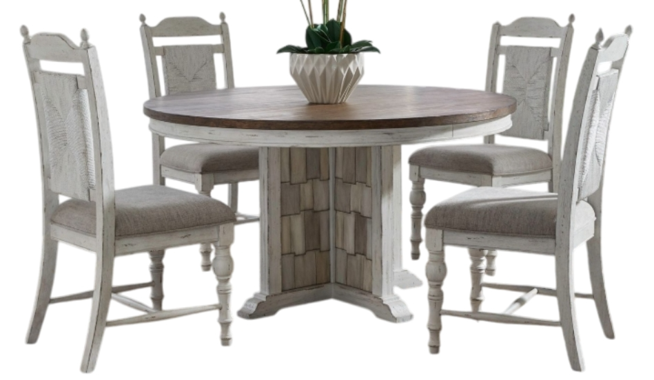 Designed to entice a sense of calm and tranquility into interior spaces, the River Place 5-piece pedestal table set strikes the perfect balance of life on the coast and a comfy home tucked away in the hills. This set includes 1 pedestal table and 4 side chairs.Read More