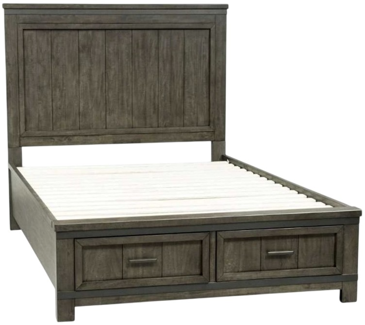 Add a natural feeling to your living space using the Thornwood Hills panel bed. The rock beaten brown finish is highlighted by saw cuts and hammered metal strip accents across the planked headboard and storage footboard. Never question the reliability of the bed due to the bolt-on rails and center supported slat system.Read More