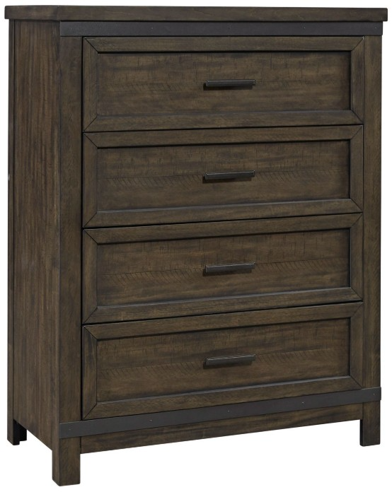 Add a natural feeling to your living space using the Thornwood Hills 4-drawer chest. This piece features a rock beaten gray finish with saw cuts, wide pilasters with block feet, planked top and sides, fully stained interior drawers, felt lined top drawer and full extension drawer glides for easy access to storage.Read More