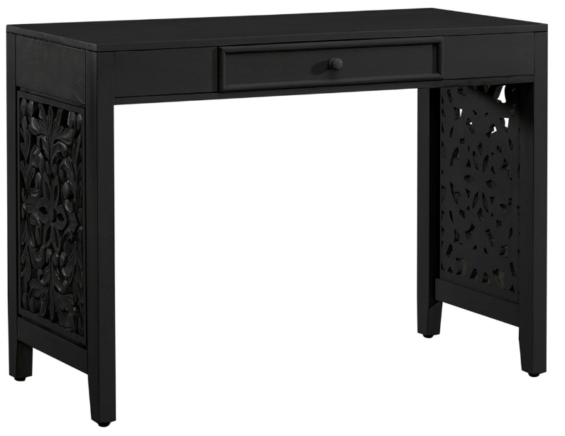 The Boho inspired Trellis Lane accent desk will make your room both function and stylish. Crafted of solid mango in a Weathered Black finish with brown rub thru. Features artisan hand carved side panels, one wood trim drawer and wood knob hardware. The perfect size for small places from your living room to a bedroom.Read More