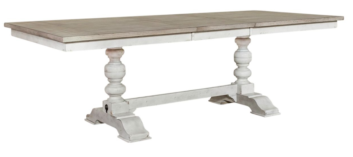 Design possibilities are endless with the Whitney trestle table. Crafted of rubberwood solids with oak veneers, this set features an antique linen finish with weathered gray top. The trestle table has a planked top with a 20” removable leaf and is anchored by heavily turned pedestals with a center trestle.Read More
