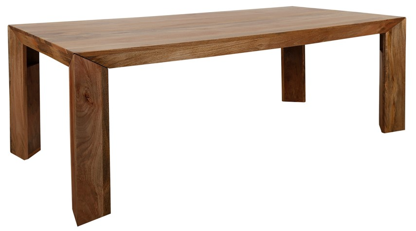 The rectangular tables' geometric mitred edge creates a seamless transition between the table top, apron and angled legs and is generously proportioned to comfortably seat up to eight guests