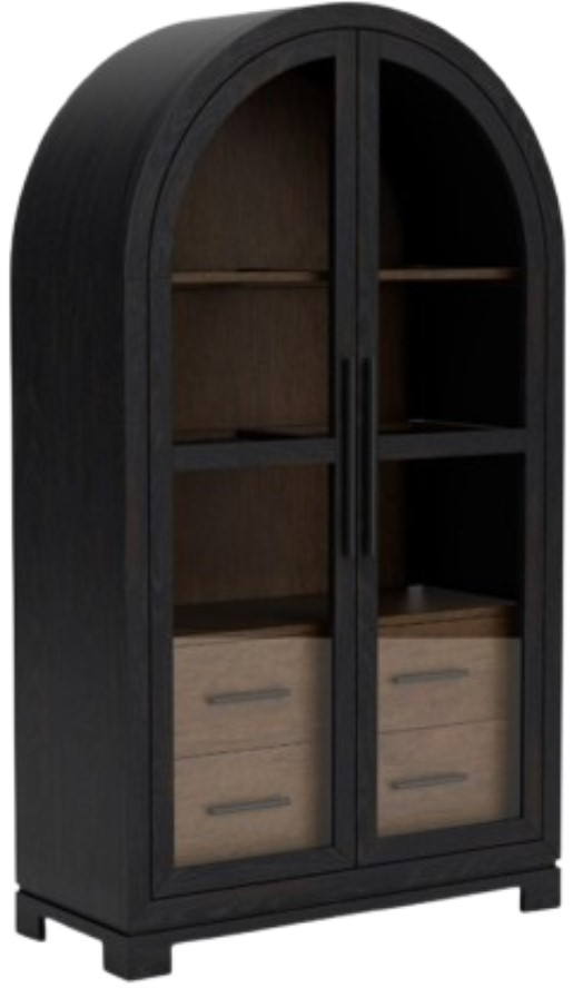 The Calhoun whiskey/ebony whiskey oak display cabinet showcases rustic sophistication with its rich two-tone finish and glass-paneled doors. Crafted from durable oak, it offers adjustable shelving and ample storage, perfect for displaying collectibles or fine dinnerware in timeless style.Read More
